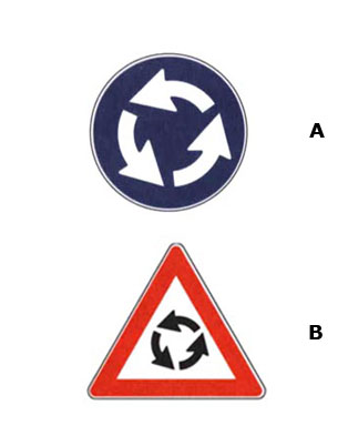 [14022_05] Il segnale di figura (A) su strade extraurbane è preceduto dal segnale di pericolo di CIRCOLAZIONE ROTATORIA in figura (B)Categoria: 04. Segnali di obbligoVero