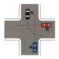 [24028_06] Nell'incrocio rappresentato nella figura il conducente del veicolo R deve dare la precedenza al veicolo ACategoria: 14. Esempi di precedenza (ordine di precedenza agli incroci)Falso