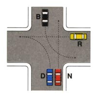 [24032_07] Nell'incrocio rappresentato nella figura il conducente del veicolo B deve dare la precedenza al veicolo R che prosegue dirittoCategoria: 14. Esempi di precedenza (ordine di precedenza agli incroci)Falso