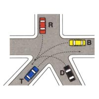 [24037_02] Nell'intersezione di figura l'ordine di precedenza dei veicoli è: R, B, D, TCategoria: 14. Esempi di precedenza (ordine di precedenza agli incroci)Vero
