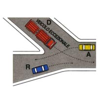 [24040_02] Nell'incrocio rappresentato in figura i veicoli transitano nel seguente ordine: R, D, ACategoria: 14. Esempi di precedenza (ordine di precedenza agli incroci)Vero